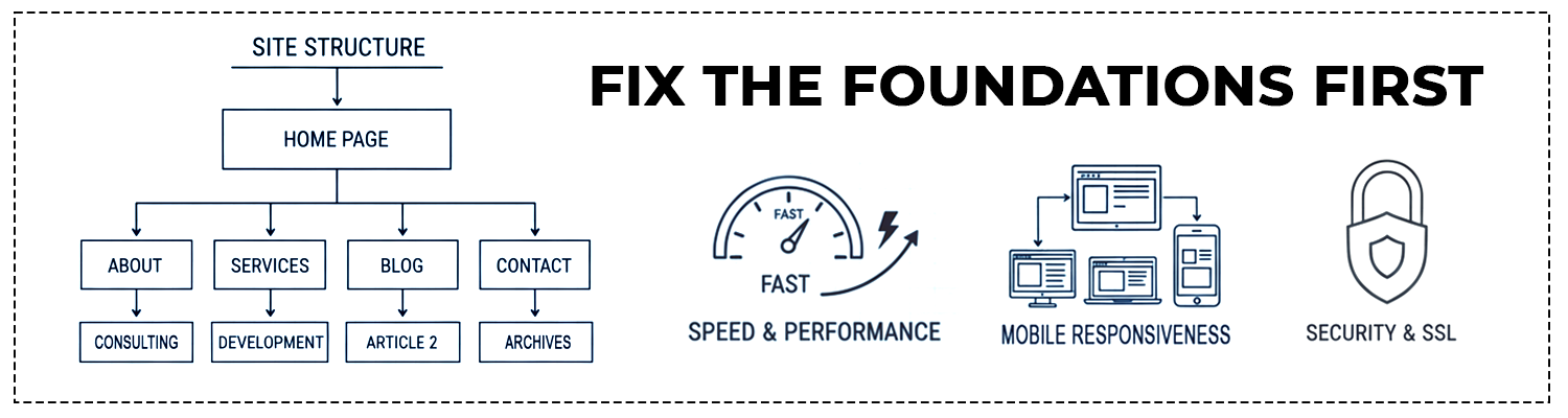 Think of it this way: if your website were a house, most audits only check the plumbing. We examine the entire structure, from the foundation to the roof, from the electrical systems to the interior design. One audit gives you complete clarity, so you don't need multiple services or wonder if you're missing something crucial.